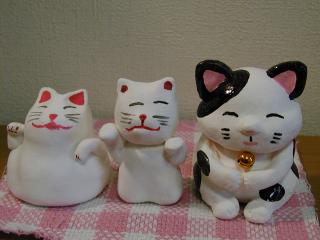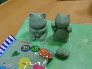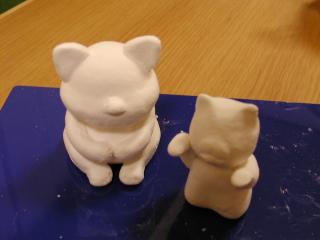 さぁ、本番。おこちゃま粘土と違って、形が作りづら〜い。見るのと、やるのじゃ大違い。私って、なんでこんなに不器用なの〜。ひ〜こら言いながら、やっとここまで完成。何か、どっちもネコに見えな〜い(^_^;) 旦那さんのなんか、熊みたい。人のこと言えないけどね。ははは・・・(汗) |