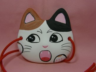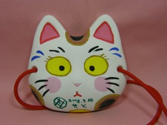 お面絵付け 2008年9月に愛知県瀬戸で開催された「来る福招き猫まつり」で体験した 絵付けのお面ねこさんです。招き猫ミュージアムお楽しみ処でやってました。 右がねこ丼@旦那さん作、左がねこ丼作。