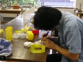 下絵は切り絵の要領で切り取っていき、砂を吹き付けて模様を出していく感じ。