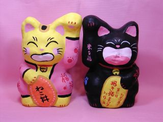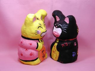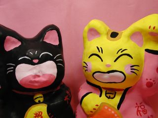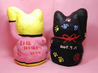 張り子絵付け 2005年9月、第11回伊勢招き猫まつり遠征の際に体験した 春日部張り子さんの絵付け招き猫さんです。 黒猫さんは、ねこ丼@旦那さん作。黄色ねこさんは、ねこ丼作。 ピンクのハッピを着せたつもりが、ピチピチセーターのようになってしまいました(^◇^;)うはは。