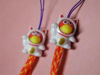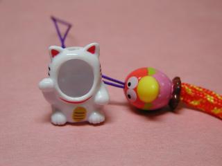 キョロちゃん招きストラップ とうとう、あのキョロちゃんまで招き猫になってしまいました。 あの超有名なお菓子「チョコボ〜ル」のおまけになっていたものです。 これがまた、めちゃめちゃかわいい! 同じ招きキョロちゃんでも表情違いとか色違いとか、いろいろあるようです。