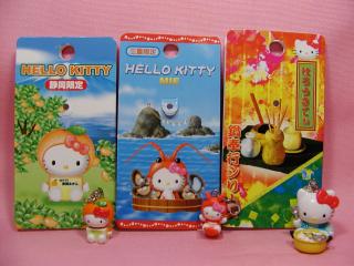 限定キティちゃん またまた見つけて参りました。ご当地キティちゃん。 静岡限定みかん箱キティちゃん、三重限定伊勢エビキティちゃん、 鍋奉行シリ〜ズ、東京名物ちゃんこ鍋キティちゃんです。