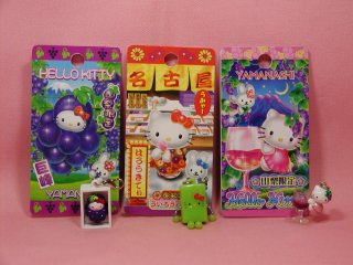 限定キティちゃん 2006年5月に滋賀県へ遠征した際にゲットした限定キティちゃんです。 すべて中央高速のサービスエリアから連れ帰りました。 山梨県限定巨峰キティちゃん、名古屋限定ういろうキティちゃん、山梨県限定赤ワインキティちゃん。 ワインキティちゃんには、白ワインキティちゃんもいました。