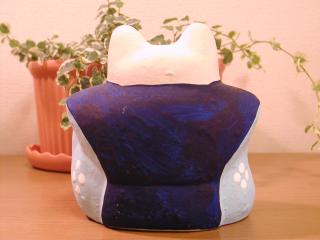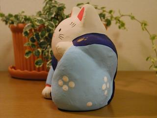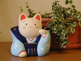 張り子招き ほのぼのした表情が印象的な招き猫です。紋付き袴っていうのも、いかにも日本的でいいですよねぇ。 手の上げ方も、ちょっと控えめなかんじで、とっても気に入ってます。 お店の棚の奥のほうで、ジーっと私のことを見てました。