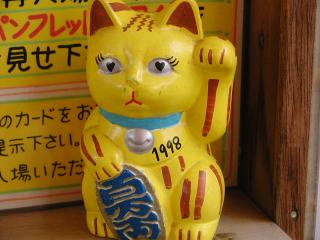 「ねこたま」の招き猫1 すみません。これはうちの子ではありません。二子玉川にある「ねこたま」の入り口にいた招き猫です。 目がハート、まつげ付き(ねこたまの人が書いたと推測?)が心をくすぐりました。 人がいっぱいで混んでいたりすると、なかなか写真なんか撮りずらいですが(入り口狭し)、 パパパっと私の早業で、なんとか・・・