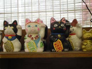 「ねこたま」の招き猫2 すみません。こちらも「ねこたま」の「にゃんこ触れ合いコーナー」にいた招き猫です。 なまにゃんさんばかりに気を取られていると、ちょっと見逃してしまいます。ご注意!