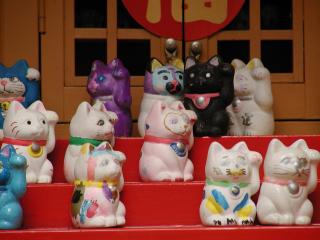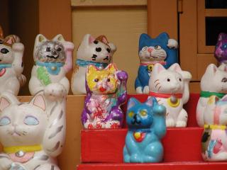 「ねこたま」の招き猫3 すみません。こちらも「ねこたま」の「招き猫神社」にいた招き猫です。 多分、白い招き猫を買って自分で色づけするんでしょう。私が行った時は売ってる所がなかったんですが。 ノーマルあり、どらえもん風あり、宇宙人風(?)あり。ちょっと怖い招き猫さんも多数あり。