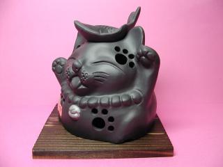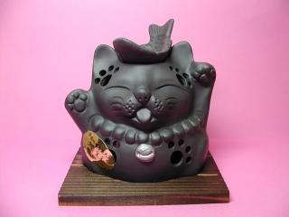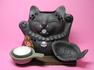 招き猫茶香炉 お茶の良い〜香りで部屋をみたしてくれる招き猫さん。 頭に乗っている魚にお茶葉を入れて、お腹のろうそくに火を灯すと、 ほのか〜にお茶の香りが漂います。リラックスタイムには最適(o^^o)
