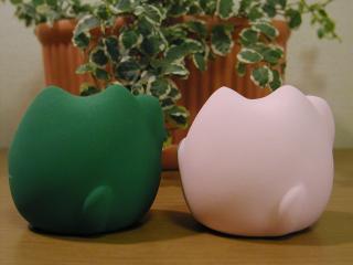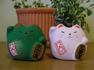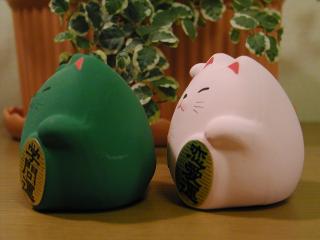 風水招き猫 今、流行りの風水の招き猫です。今はこの2種類だけですが、この他にも5色ほどあります。 形がまん丸で、見てるだけで福を招いてくれそうです。