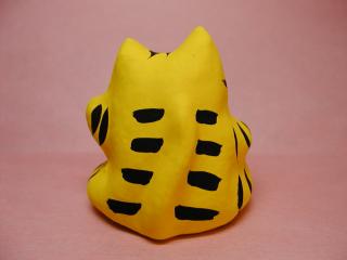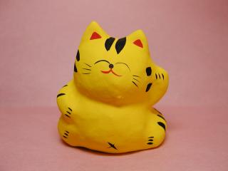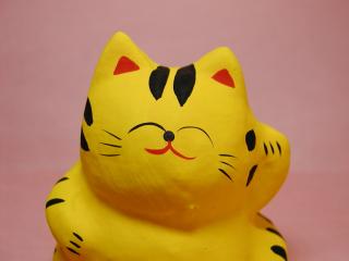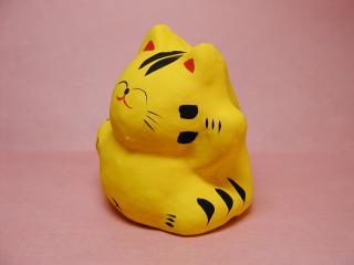 トラ招き猫さん 鮮やかな黄色が眩しいトラ猫の張り子の招き猫さん。 おへその「X」がかわいい(=^m^=)