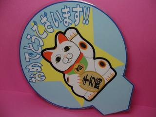 大当たり招き猫さん これ、何だか分かります?(=^m^=) パチンコ屋さんで大当たりが出た時に台の上に差してくれるプレ〜トです。 パチンコ屋さんから無理言って貰って来ちゃいました(^^ゞ