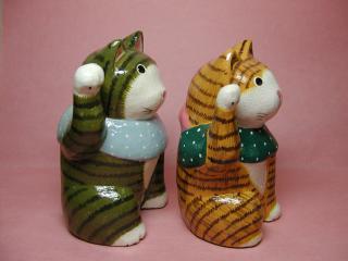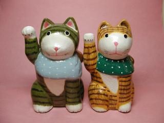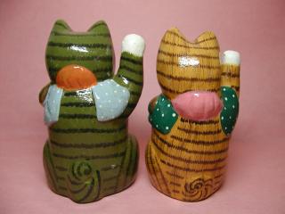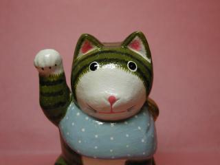 トラ招き猫さん 2002年5月「ギャラリ〜猫町」さんで開催されたイベントから 連れ帰った招き猫さん。1つ200円くらいだったかな?(^^ゞ 木で出来た軽めの招き猫さん。とぼけたお顔がかわいい。