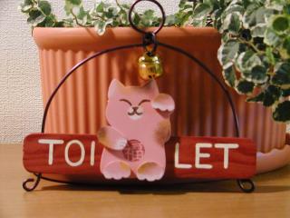 ドアプレート 招き猫のドアプレートです。地元の雑貨屋さんで購入しました。 お腹に印刷された「福」がキュート。鈴もついているので、トイレのドアを開けた時にチリチリンと 音がします。こんなとこにまで招き猫?トイレに入るのが楽しみに(?)なります。