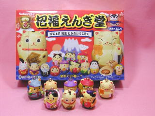 招福えんぎ堂 お菓子メーカー「カバヤ」から2003年12月に発売された 「招福えんぎ堂」というお菓子のオマケです。 全20種+シークレットのうちの8種類が招き猫さんです。 七福神の招き猫さんに開運招き猫さん。ちなみにシークレットは「鬼」。 すべて「おきあがりこぼし」になっています。付属の組みひもを付けることもできます。