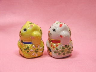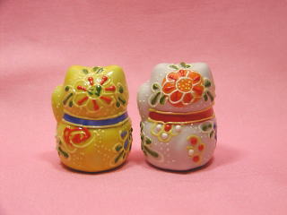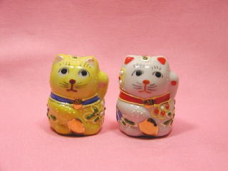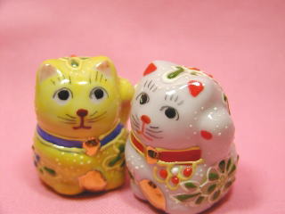 九谷焼招き猫さん 身長3cmほどの九谷焼の招き猫さん。 こんなに小さいのに、ちゃんと九谷焼してます(=^m^=) お店のおばさんの話しによると九谷焼の作家さんさんが 試しに(?)作ってみたんだとか。。。 ちょっとお間抜け顔なところが、またかわいい(o^^o)