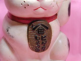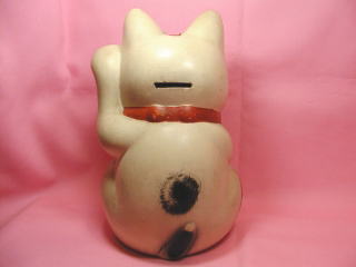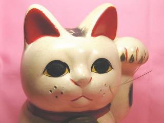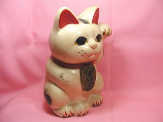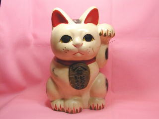ヒゲタ招き猫さん お馴染みお醤油メーカー「ヒゲタ」の販促品として作られた招き猫さんです。 大きなリボン付きの女の子バージョンとリボンなしの男の子バージョンが ありますが、こちらは男の子バージョン。 女の子バージョンのリボンも黄色と赤があるようです。 おひげも手書きとナイロン製があります。作られた時期によって違うようです。 うちにお招きしたネコさんは、おひげが抜けてしまって、ちょっと汚れてて、 模様も薄くなってしまっているけど、その分、年代を感じさせるかな?
