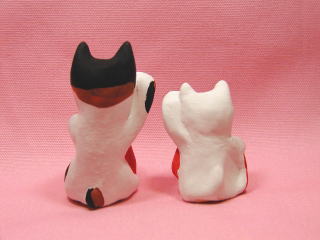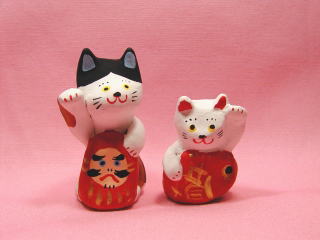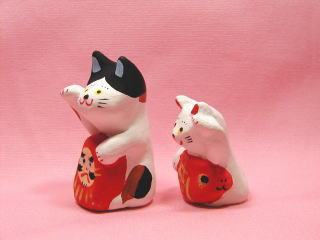 倉敷土人形招き猫さん だるまと鯛を抱いたくりくりお目目の招き猫さん。 この素朴な感じがいいです(o^^o) 鯛招き猫さんの上目遣いもポイントッ!