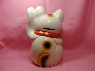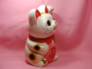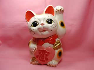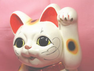 恋招き招き猫さん 矢が刺さったピンクのハートを抱えた恋愛成就の招き猫さんです。 このタイプではへの字口の招き猫さんが多いなか、 ちょ〜っと口を開けて微笑んでいる感じの優しいお顔付き(o^^o) 蝶ネクタイ風のリボンもポイントかな(=^m^=)
