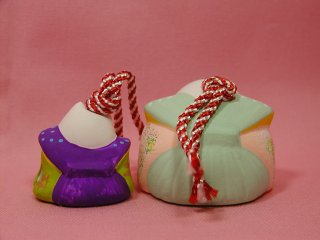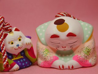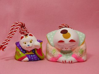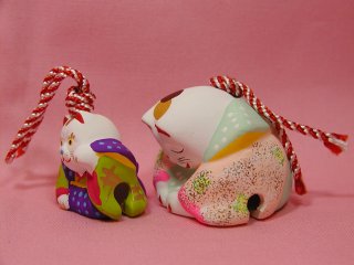 土鈴招き猫さん 羽織袴姿の土鈴になっている招き猫さんと、おじぎネコさんです。 カラカラカラ。。。と乾いた音がします。