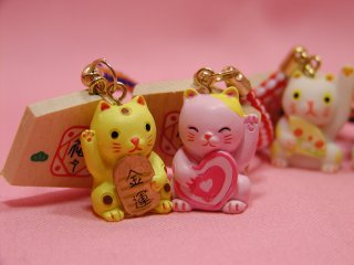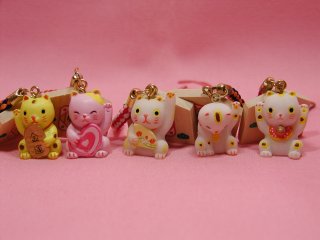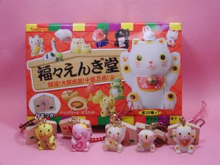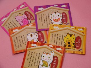 福々えんぎ堂 カバヤから発売された食玩「福々えんぎ堂」。 縁起物全20種類シークレット1種類のうち、招き猫さんは7種類。 う〜ん。。。フルコンプならず。。。(>_<)ゞ 縁起の良いお言葉が書かれた絵馬とカードもついています。