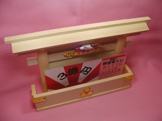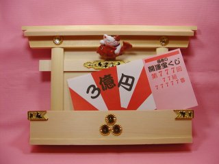 宝くじ入れ招き猫さん お友達からプレゼントして頂いた招き猫さん付きの宝くじ入れです。 神社風になっていて、ちょうど宝くじの大きさのポケットが付いています。 これに宝くじを入れて、毎日拝めば、3億円も夢じゃない?(=^m^=)