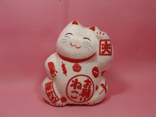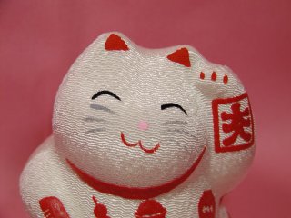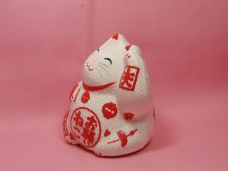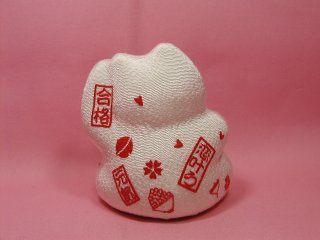 ちりめん招き猫さん 「大入り」、「合格」、「元気」などなど、かなり欲張りな縮緬の招き猫さん。 どっしりとした体つき、まんまるのお顔がかわいいです。