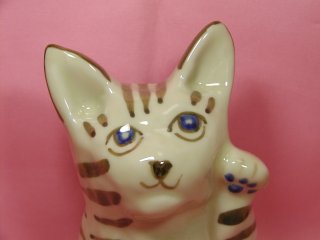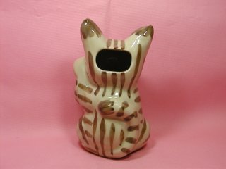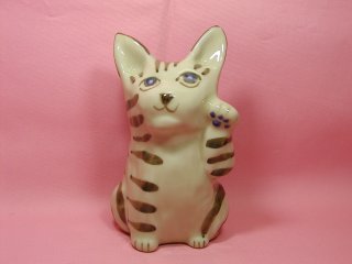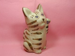 洋猫系(?)招き猫さん 耳の大きなスッとした招き猫さん。 青い目に青い肉級。 頭の後ろに穴が開いています。灰皿?貯金箱?うう〜む。。。?