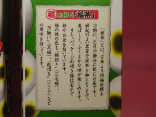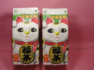 福茶 2006年1月に発売されたカルピスの黒豆入り福茶です。 プクプクのかわいい招き猫さんのパッケージ。 この招き猫さん達がコンビニにズラ〜ッっと並んでいる姿は壮観でした(≧∇≦) 「福茶」とは年の初めや節分などに招福祈願を目的として飲用するお茶のことで、 古来より日本各地に伝わる風習のひとつだそうです。