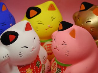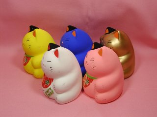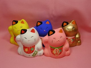 風水招き猫さん 色や方角によって福をもたらすと言われる風水。 黄色や青、金色などの招き猫さんのお腹には縁起の良い方角が示されています。