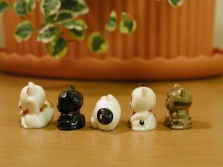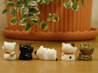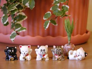 極小招き猫 1つが2cmほどの小さい招き猫です。 後ろに置いてある鉢植えは、ドールハウス用に私が作りました。 枝の部分はマッチ棒なんです。