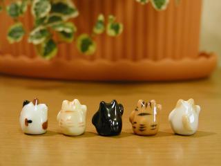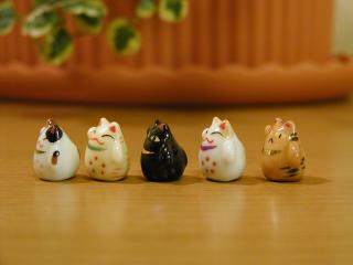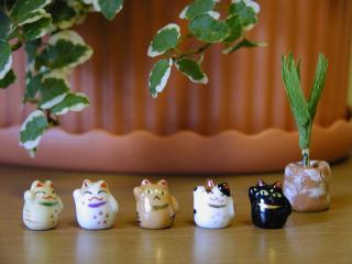 もっと極小招き猫 1つが1cmほどの小さい小さい招き猫です。 なぜか顔つきが、みんな困ったような表情なのは、なぜ?