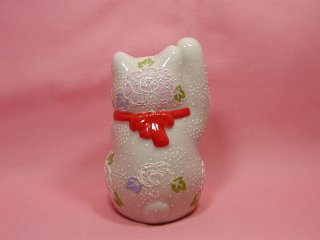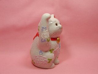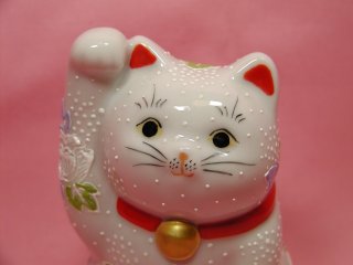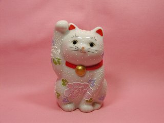 九谷焼招き猫さん 割と派手な色合いの多い九谷焼の招き猫さんですが、 この淡い色合いに惹かれてお招きしました。 お顔付きも優しい〜雰囲気。