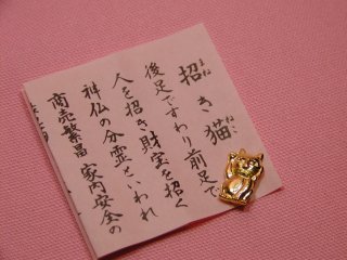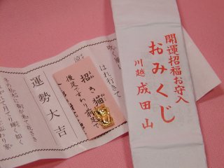 おみくじ開運招き猫さん おみくじに入っていた招き猫さんです。 川越成田山の開運招福お守り。右手挙げ招き猫さん。