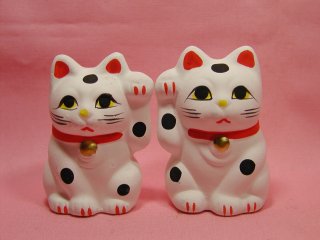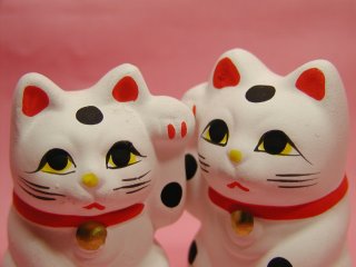 黒丸招き猫さん 2007年9月に三重県伊勢で開催された来る福招き猫まつりから 連れ帰った招き猫さんです。 なんだかちょっと寂しそ〜なお顔が気になって連れ帰りました。 テンテンテン。。。って感じの黒丸模様もかわいいです。