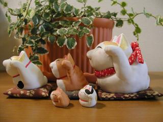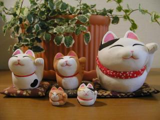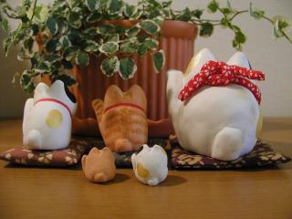 「まりこや」さんの招き猫 前々から、うちへお招きしようと思っていたところ、ちょうど「クラフトフェスタ」のお知らせを頂いて、 この機会にと購入した「まりこや」さんの招き猫です。一番大きいのが「大福猫」、中位のが「福福猫」、 小さいのが「小招き」です。すべて手作りで「まりこや」さんの優しさがネコちゃん達の表情から 伝わってきます。おひげがないのが特徴とか。 私も、うちにお招きしたいという方は、MARIKOさんの「らくがきぺーじ がちゃぽん」へGO。