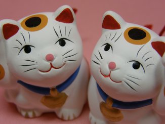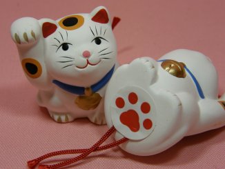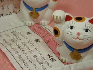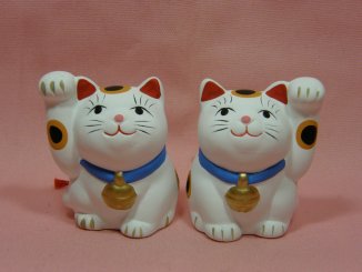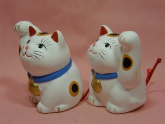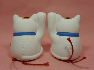 招き猫おみくじ 伊勢の招き猫まつりから連れ帰った招き猫さんです。 ねこ丼家毎年恒例、吉兆招福亭の招き猫おみくじ。 2008年は首輪が青色でした。