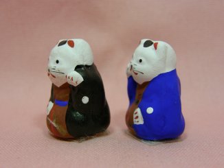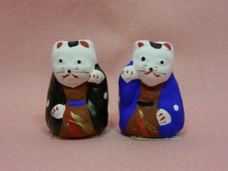 初辰猫 伊勢の招き猫まつりから連れ帰った招き猫さんです。 月に一度、大阪の住吉大社で授与される招き猫さんです。 ねこ丼家では毎年一対づつ伊勢から連れ帰ってます。