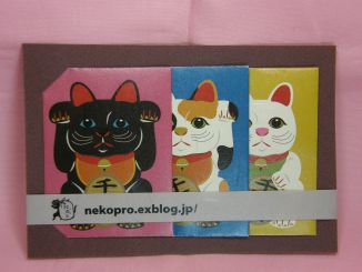 ポチ袋 2008年12月に東京谷中のギャラリー猫町で開催された「猫のぽち袋・手ぬぐい展」 から連れ帰った招き猫さんのポチ袋です。 両手挙げの黒猫さん、右手挙げの白猫さん、左手挙げの三毛猫さんの最強タッグ(=^m^=)