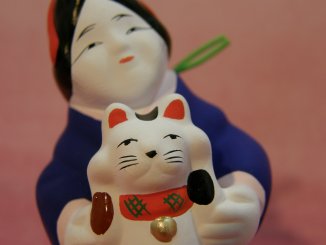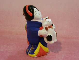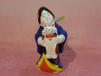 日本招猫倶楽部復刻招き猫さん 2009年9月に愛知県瀬戸で開催された「来る福招き猫まつり」から連れ帰った招き猫さん。 2009年の復刻招き猫さんは、名古屋土人形の「猫抱きお福」。