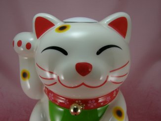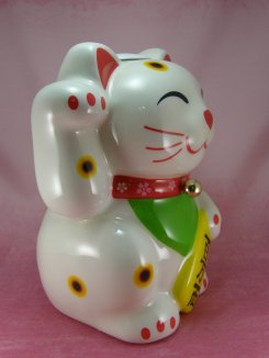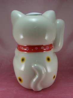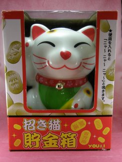 招き猫貯金箱 招き猫さんの貯金箱。頭からお金を入れると「にゃ〜にゃ〜にゃ〜」と鳴きます。 かなり大きめなので、いっぱいにするには大変(^_^;)