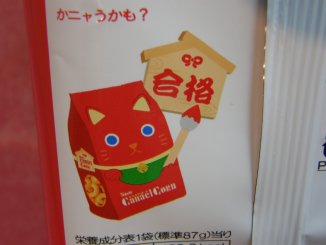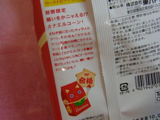 カナエルコーン 受験シーズン限定のキャラメルコーンの招き猫さんパッケージ。 その名もカナエルコーン。中身は同じキャラメルコーンですが、いくつか星形が入ってました。