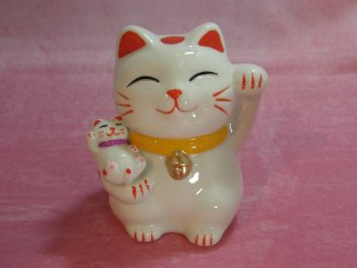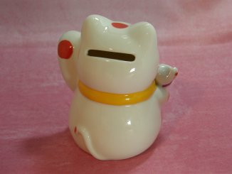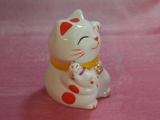 百均招き猫さん 百均のお店にいた招き猫さん。貯金箱になっています。 抱いている小さい招き猫さんのお顔がビミョ〜な感じ(=^m^=)