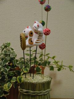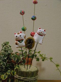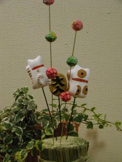 串人形招き猫 台となる俵に自分の好きな串人形を刺して飾ることのできるものです。 とりあえず、私は招き猫さん2種類とチリメンの飾り物、千万両をチョイスしました。 この他にも「だるま」や「「はな」などおめでたい物が10種類以上ありました。