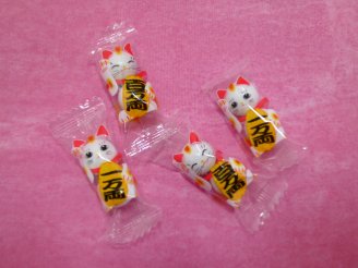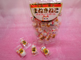まねきねこチョコレートボール 白くコーティングされたチョコボールが二粒パッケージされた袋に 招き猫さんのイラスト(正確には耳、お顔、手、首輪、小判)がプリントされています。 中身は真っ白なチョコボールのみ。う〜ん、良くできてるなぁ。。。と感心。
