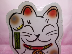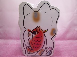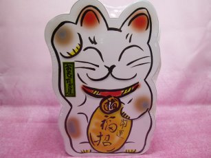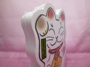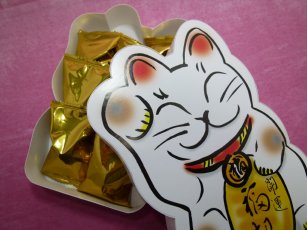 招き猫さんのお菓子 瀬戸から連れ帰った招き猫さんパッケージのお菓子。 中身はフツ〜の(=^m^=)クランチチョコでした。