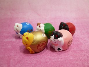 風呂敷招き猫さん 愛知県瀬戸にあるおもだか屋さんから連れ帰った招き猫さん。 色とりどりの風呂敷を背負った小さな招き猫さんです。