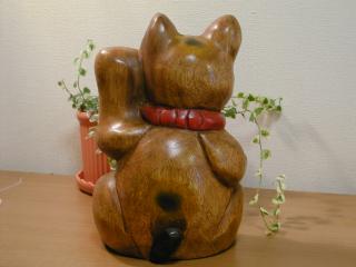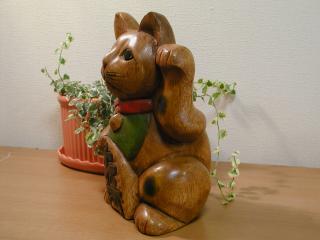 椰子の木招き猫 先日行ったフリマで出会った招き猫さんです。 椰子の木で作られているそうです。お店には2体ほど置いてありましたが、 手作りと言うことで、もう1体の招き猫さんには、ヒゲがありませんでした。 作った人が、書き忘れたみたい(^_^;) 耳も左右で大きさが違うし・・・。ちょっと味があるでしょ?