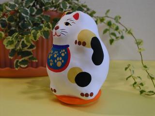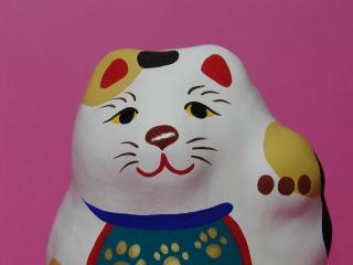 張り子の招き猫さん この張り子の招き猫さんは、本焼きにした原型に和紙を張り重ね、型からはがした生地に ニカワと調合した故粉を塗り、アクリル絵の具で彩色したものです。 張り子の招き猫さんは、ぼんやりとしたものが多い中、 とっても発色がよく、綺麗な招き猫さんです。 「張子工房ウスイさん」のものです。