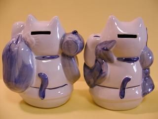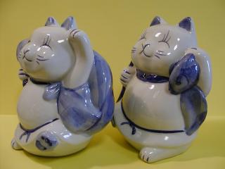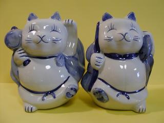 招き猫神様 七福神さんの中のお二人。大黒天と恵比寿天の招き猫さん。 全国陶器市で出会った招き猫さんです。身長20cmほどとちょっと大きめ。 なぜか、お二人とも片足を上げてやる気満々なのね〜(*^o^*)