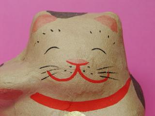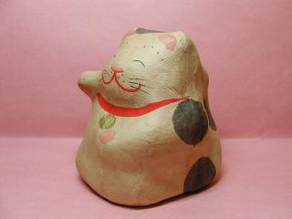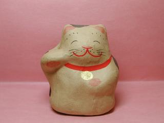 張子招き猫さん うれしいお客は左手招き、お宝金運右手招き、海の守りは雄の三毛、 病を治す黒の猫、一番強力、3匹招き。(作者さんのお言葉) ん〜だったら、家は最強軍団に取り囲まれてるってことでしょうか〜(*^m^*) 山形、蔵六面工房さんの招き猫さんです。